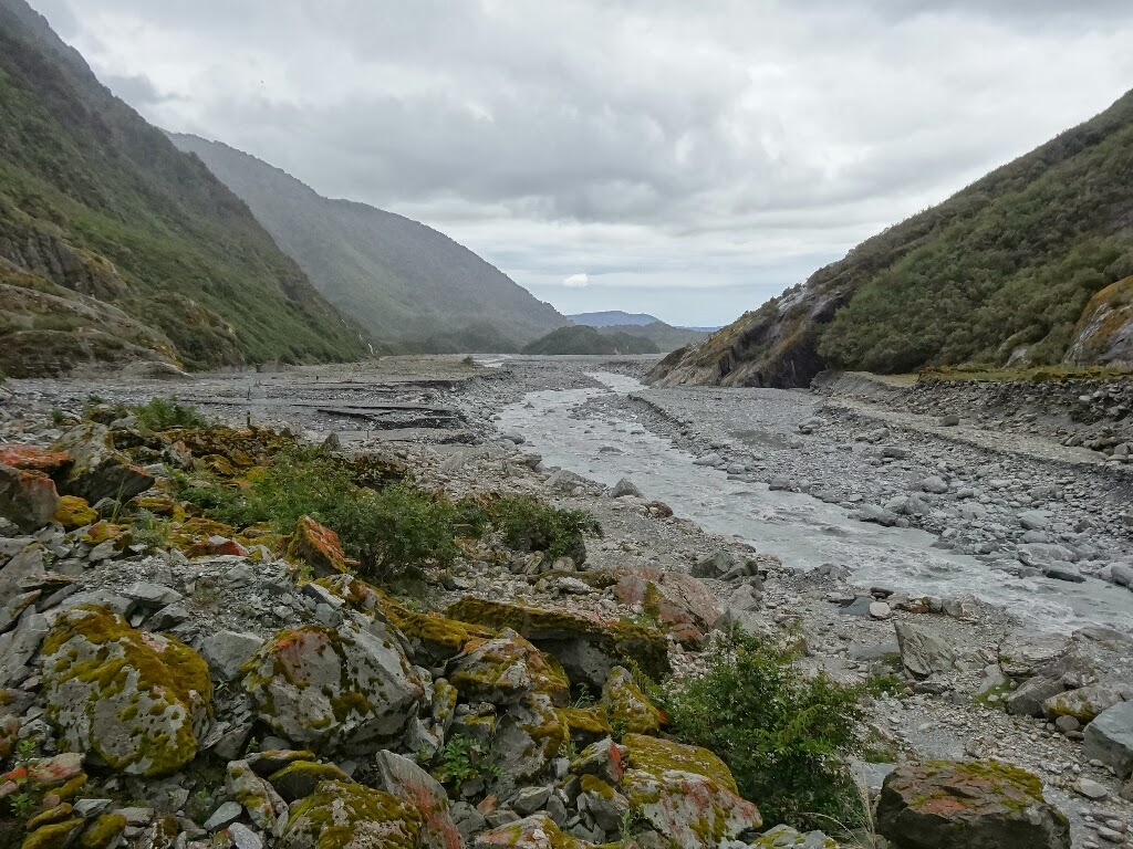 Le lendemain matin, on aperçoit à nouveau les montagnes. Une petite marche en forêt nous mène à un point de vue sur le glacier Fox. Le contraste est étonnant entre cette forêt à fougères arborescentes et la vallée glaciaire.