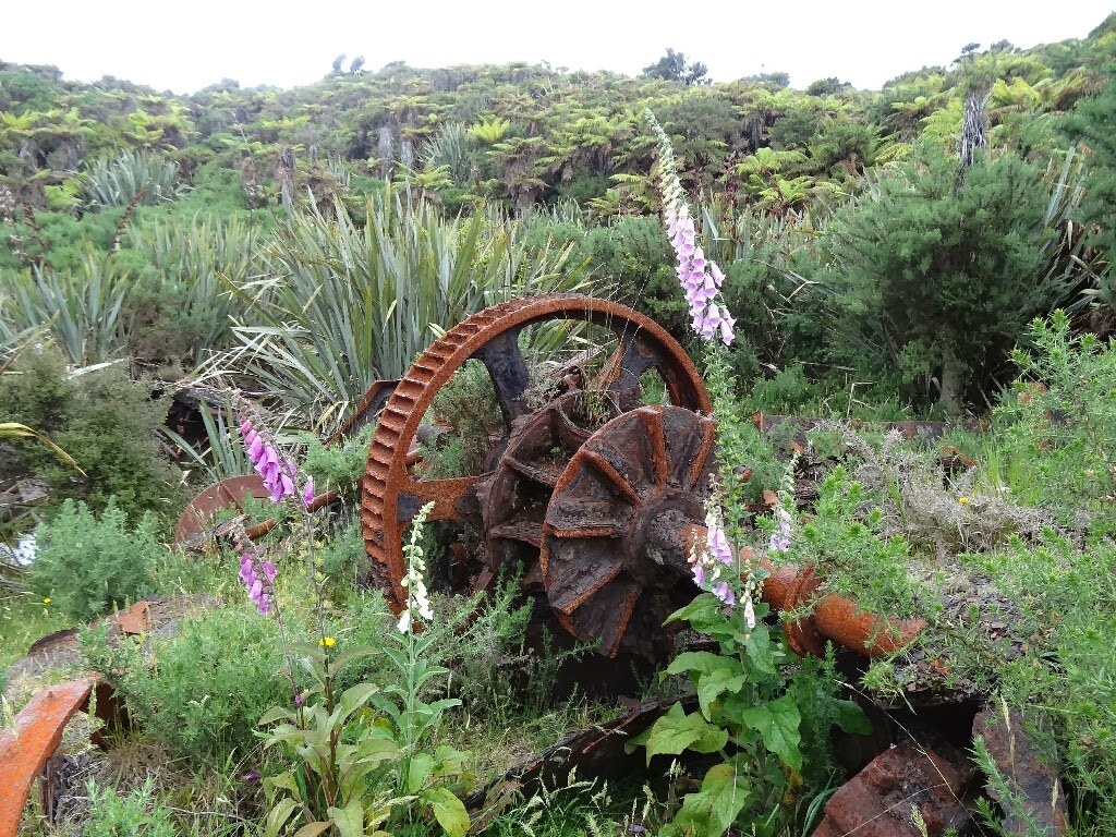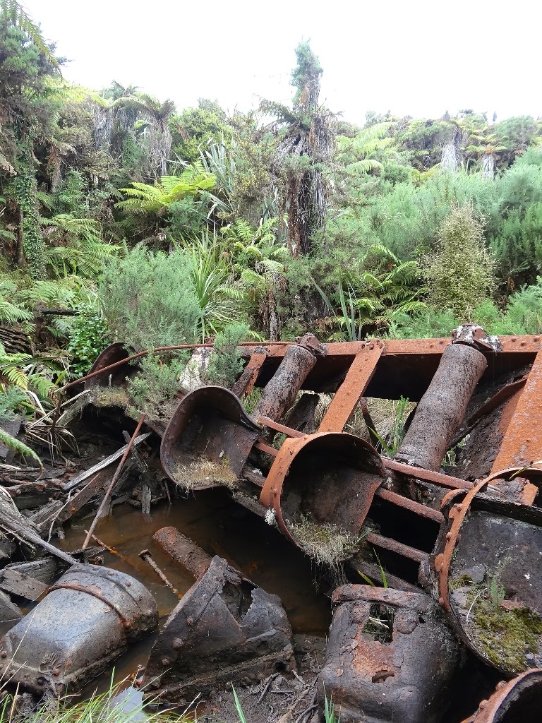 Après déjeuner nous reprenons la voiture jusqu'au glacier Fox. Le ciel s'est assombri, les montagnes sont dans les nuages, on ne voit plus rien. Nous rejoignons un camp Basic du DOC au bord de la plage Gillespies. C'est un très beau site avec une belle plage de galets. Dans la végétation en arrière des dunes on retrouve d'anciennes machines toutes rouillées qui étaient utilisées pour la recherche d'or.