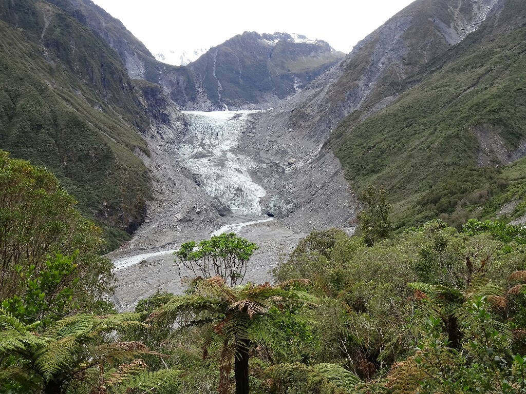 Le lendemain matin, on aperçoit à nouveau les montagnes. Une petite marche en forêt nous mène à un point de vue sur le glacier Fox. Le contraste est étonnant entre cette forêt à fougères arborescentes et la vallée glaciaire.