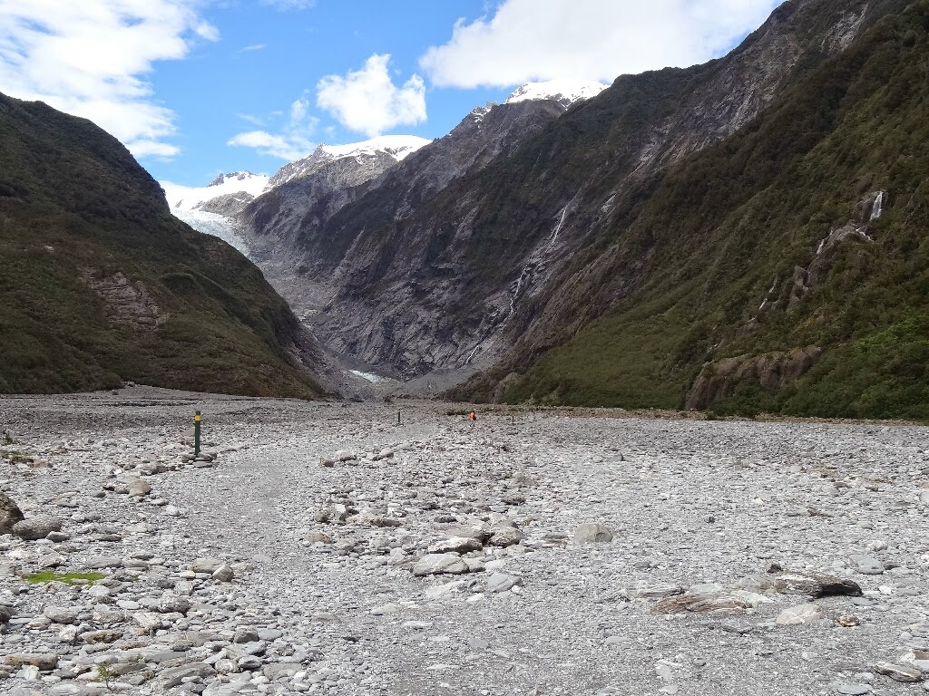 Nous partons ensuite pour le glacier Franz Joseph. Nous l'apercevons d'abord de loin puis nous nous en approchons à pieds. Ce glacier a beaucoup reculé depuis 2008, il arrivait alors jusqu'à la moraine à droite.