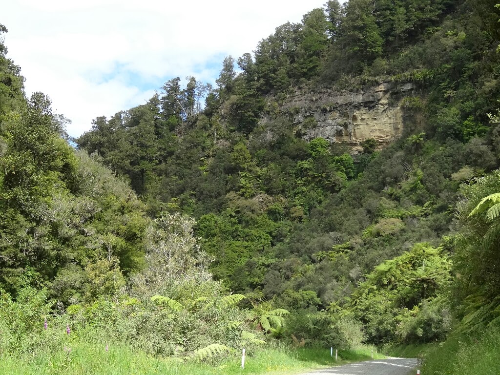 Notre rando dans le Parc National de Tongariro terminée, nous fillons vers l'Ouest espérant apercevoir le mont Egmont (ou mont Taranaki). Nous empruntons la très jolie "route du monde oublié", elle n'est même pas goudronnée en totalité.