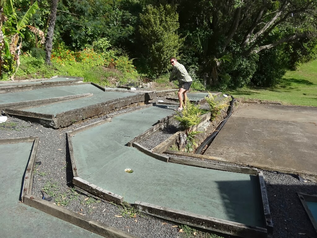 Nous roulons jusqu'à la ville de Thames. Nous y trouvons un petit camping sympathique avec une serre au papillons, une piscine et un mini-golf !