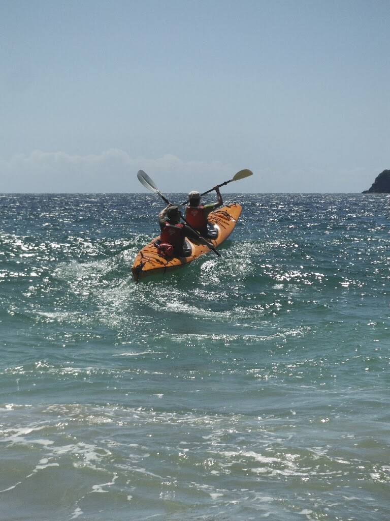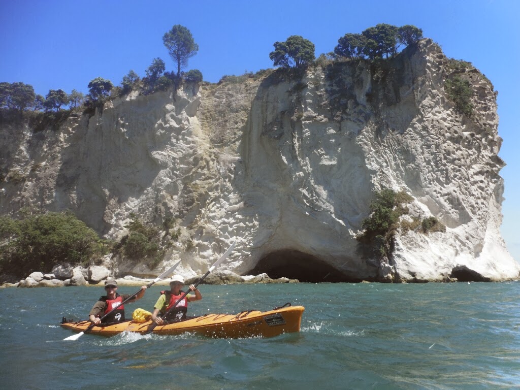 Le lendemain à 9h nous embarquons sur notre kayak pour une sortie de 3h30 accompagnés d'un guide et d'une autre touriste. Nous faisons d'abord le tour d'une petite île en face de la plage. La mer est plutôt houleuse, ça bouge pas mal. Nous passons dans une grotte avec le kayak puis on se dirige, à contre vent, vers la plage de "Cathedral Cove", il faut tirer fort sur les pagaies.