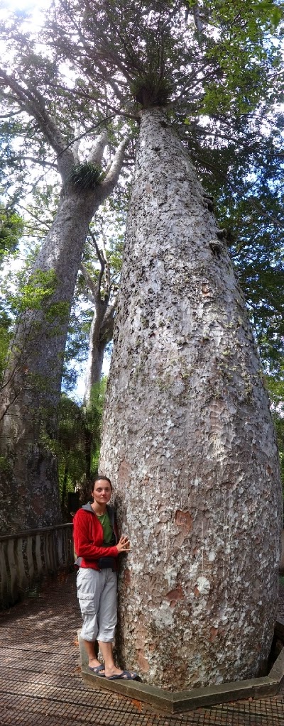 Nous faisons un premier arrêt pour aller voir un kaori, l'espèce d'arbre la plus grosse de Nouvelle-Zélande. Nous traversons une forêt avec des fougères arborescentes immenses puis nous apercevons ce fameux kaori, il est âgé de 600 ans.