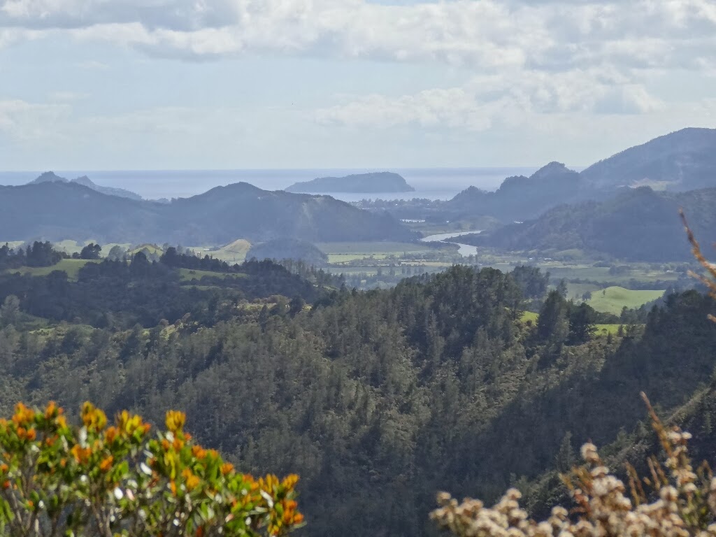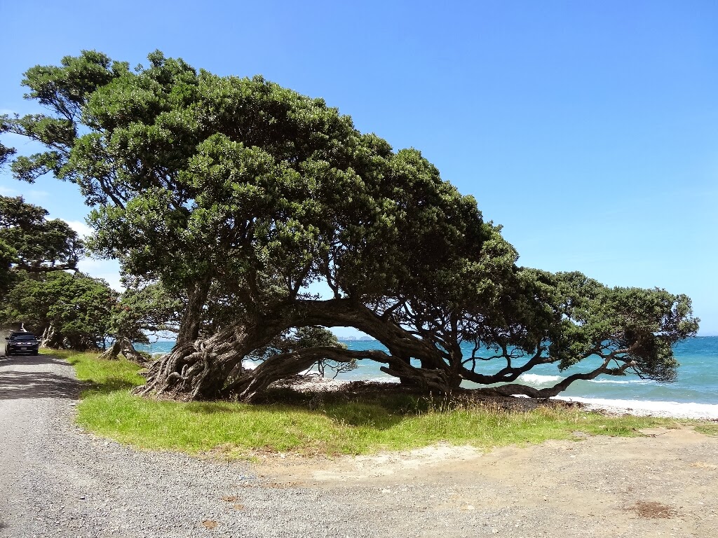 Nous continuons notre route vers le Nord en suivant la côte sur une piste bordée de Puhutukawa, ou "christmas tree" car ils fleurissent à Noël. Ces vieux arbres ont des formes extraordinaires, ils se tordent à cause du vent, se cassent et repartent de plus belle.