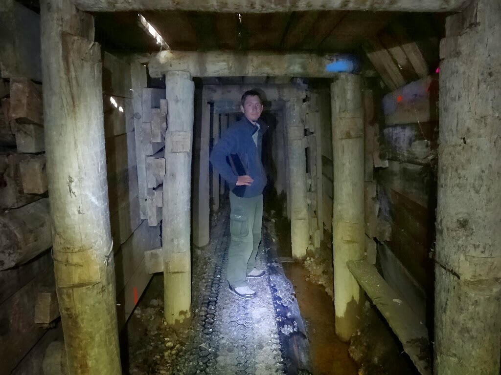 Le chemin de randonnée suit les anciens rails de la mine et nous pouvons aller explorer certaines galeries. Nous y retrouvons des glow worms (vers lumineux) et quelques vestiges de l'exploitation. Boris scrute toutes les parois en quête de la grosse pépite qui nous rendra riches. Finalement, il joue le mineur à grands coups de cailloux sur le filon et décroche un bout de quartz contenant ce qui semble être une paillette. Super content d'avoir trouvé de l'or, il pourrait rester là à casser du cailloux pendant des jours mais Édith s'impatiente.