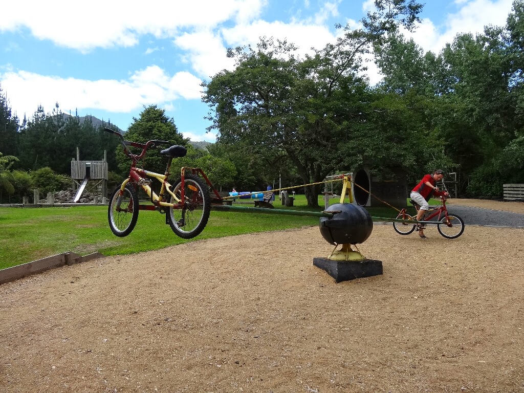 Puis on s'arrête pour visiter une sorte de parc d'attraction artistique, éducatif et humoristique rassemblant diverses activités et sculptures autour de l'eau et fabriquées à partir de matériel de récupération. On retombe en enfance : courses de petits bateaux, batailles d'eau, mécanisme à activer et qui parfois nous arrose, vélo volant, cage à hamster, chamboule tout géant,... On s'éclate comme des gosses.