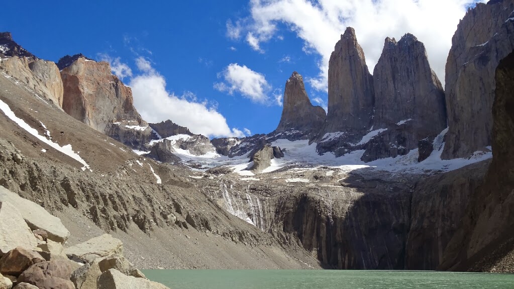 Autour de nous des montagnes aux pics acérées, des glaciers suspendus et "los Cuernos", tout est très impressionnant. De temps en temps de la glace et de la neige se détachent des glaciers et le bruit produit résonne dans toute la vallée.