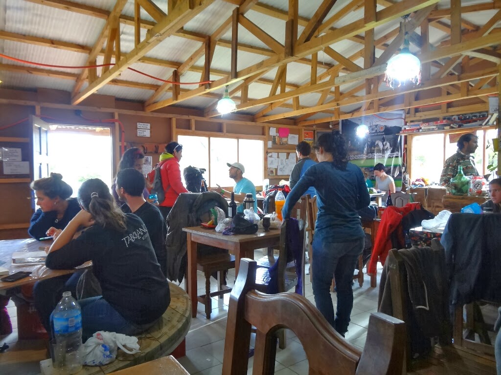 A la sortie du bus, nous partons à l'assaut des guesthouses et autres hospedaje, hostal, hosteria et cabana, à la recherche d'un lit. Mais voilà comme toutes les villes touristiques de Patagonie, il y a du monde, tout est quasi plein. Comme d'habitude on fini par poser notre tente au camping qui lui aussi est quasi plein. La pièce pour manger est bondée à toutes heures de la journée.
