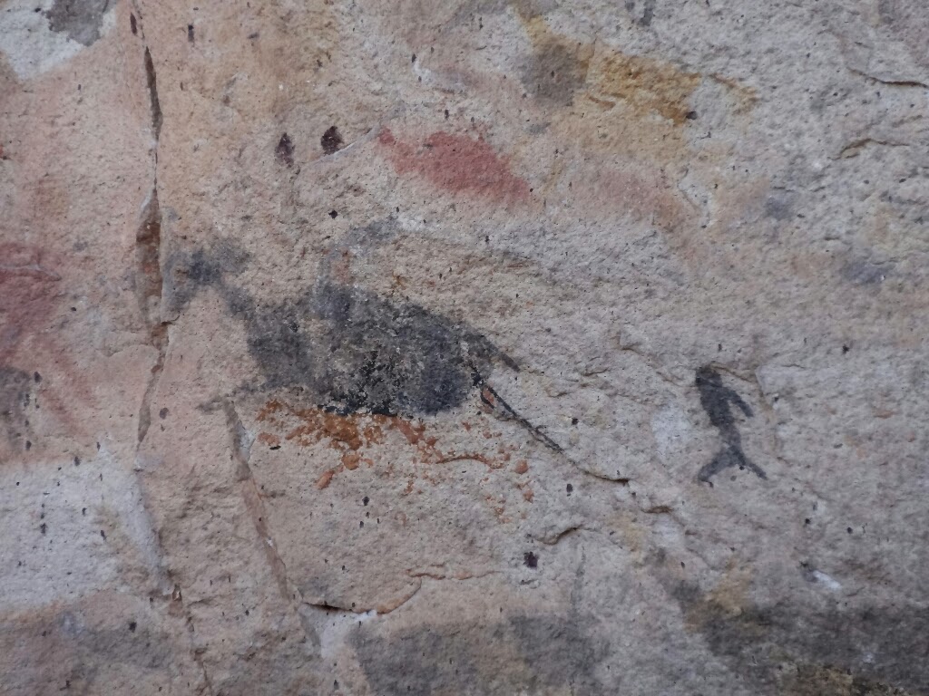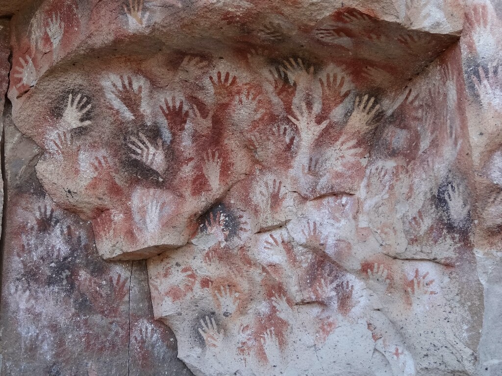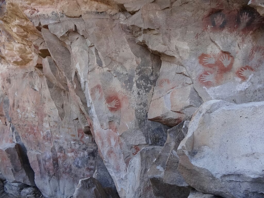 Puis nous remontons de l'autre côté où se trouve l'entrée du site. De là une visite guidée est organisée le long de la falaise où se trouvent des peintures rupestres datant de 8000 ans avant Jésus-Christ à 1000 ans ap-JC. Des groupes humains ont occupé ce canyon durant 9000 ans. On trouve les fameuses traces de mains.