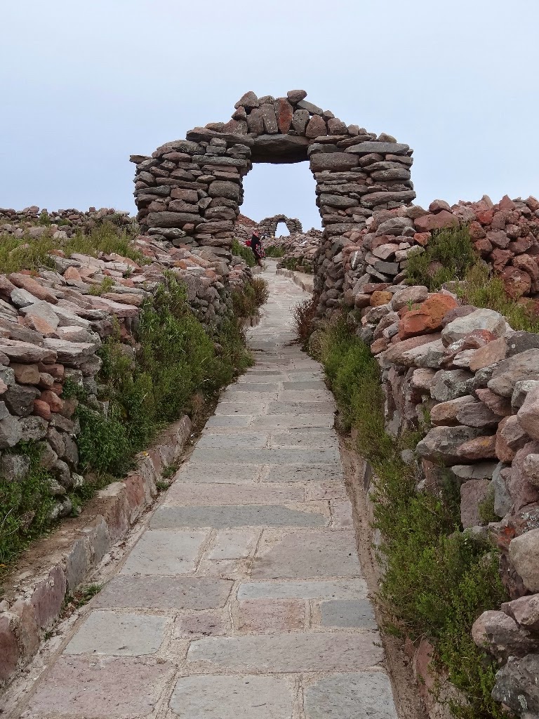 Nous parcourons pendant 3 heures le chemin des crêtes que les incas appelaient "Route sacrée de l'éternité du soleil", rien que ça ! Ce chemin procure de belles vues sur les terrasses, sur les baies et sur le lac.