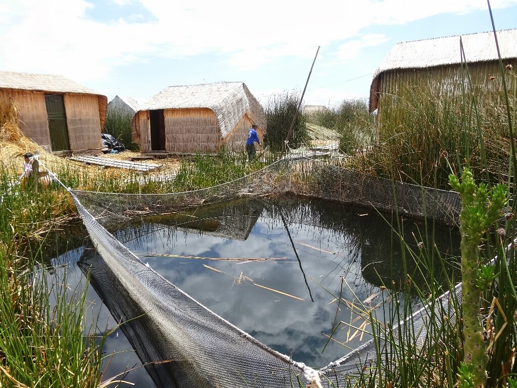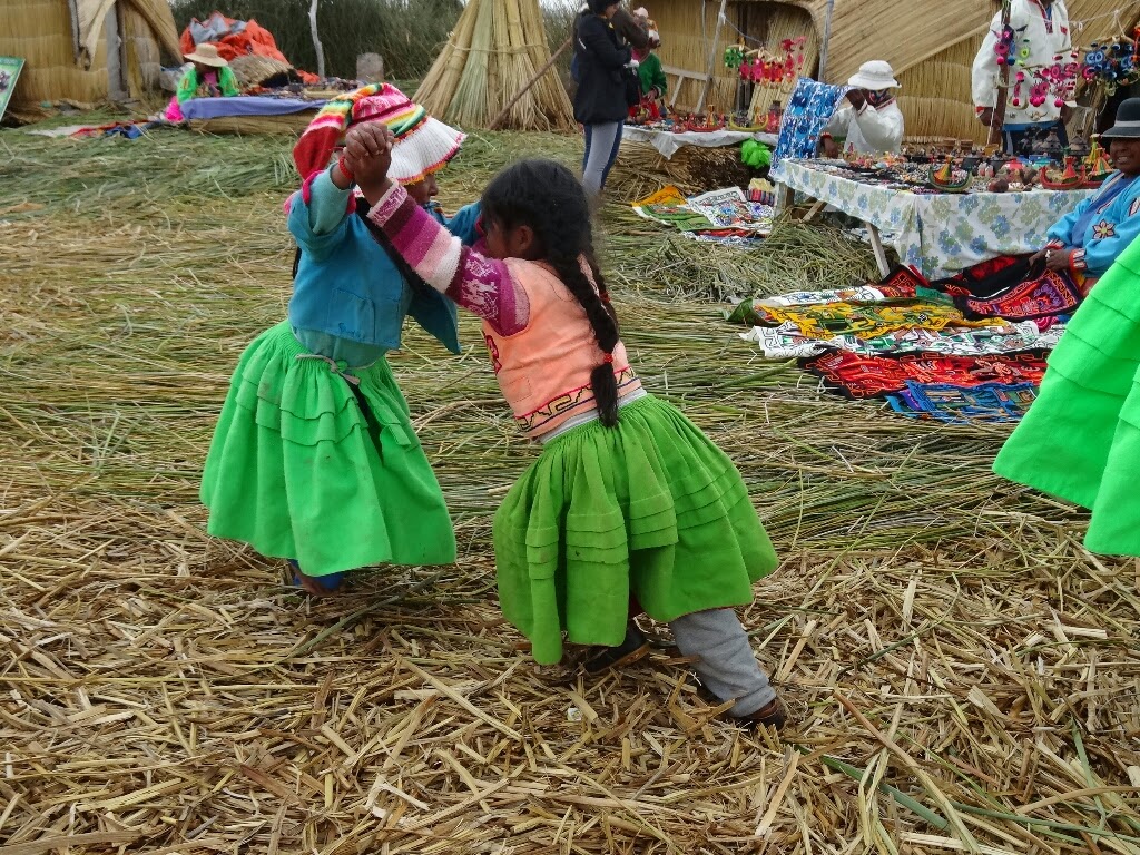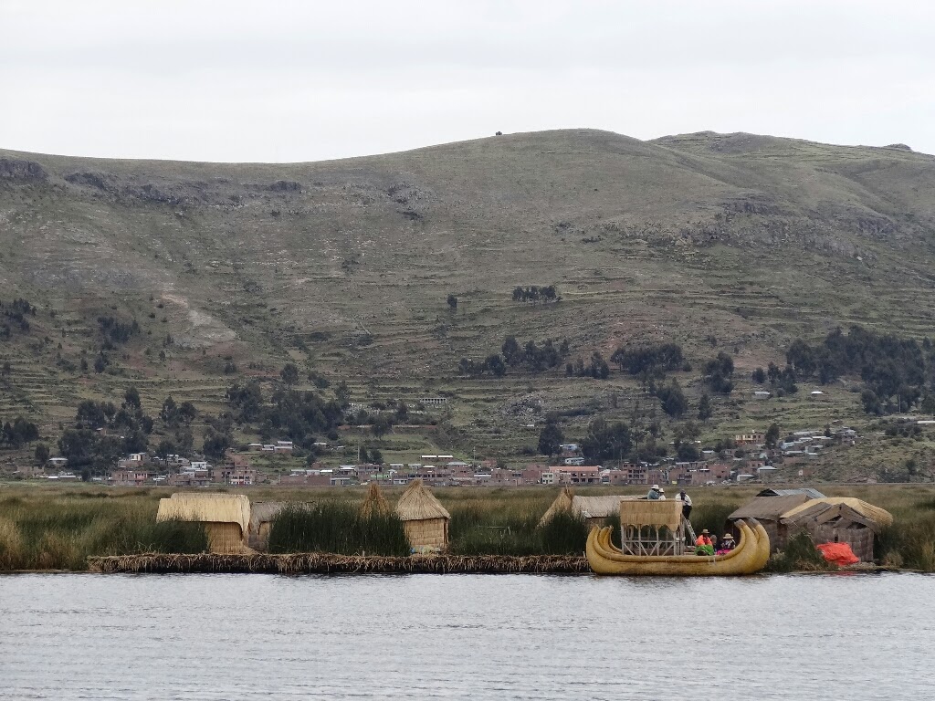 Les gens qui vivent là sont Aymaras, ils nous accueillent en costumes traditionnels. Notre guide nous donne quelques explications générales sur le lac puis sur les îles et en particulier sur leur construction. Une île flottante a une durée de vie d'environ 25 à 30 ans. Elles sont fabriquées à partir des joncs qui poussent sur le lac. Des blocs de racines de joncs sont découpés et décollés du fond de l'eau. Ces morceaux mesurent environ 1m par 5m sur 50cm de haut et flottent. Ils sont transportés sur le lieu où doit être construite l'île. Puis ils sont maintenus ensemble par des cordages. Par dessus sont déposés les joncs en couches successives sur 2m d'épaisseur. Tout cela flotte bien et est solidement amarré au fond du lac avec des cordes et des pieux en bois. Sur l'île sont ensuite construites les maisons de chaque famille.