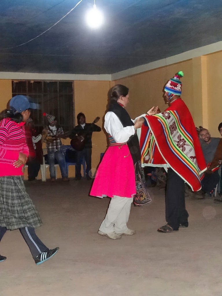A 20h nous sommes conviés à une petite fête. Pour l'occasion Eugeña nous fait revêtir le costume traditionnel de fête : poncho et bonnet pour Boris, jupe, chemisier et châle pour Édith. Nous voilà vêtu en Quechua (à fond la forme !).