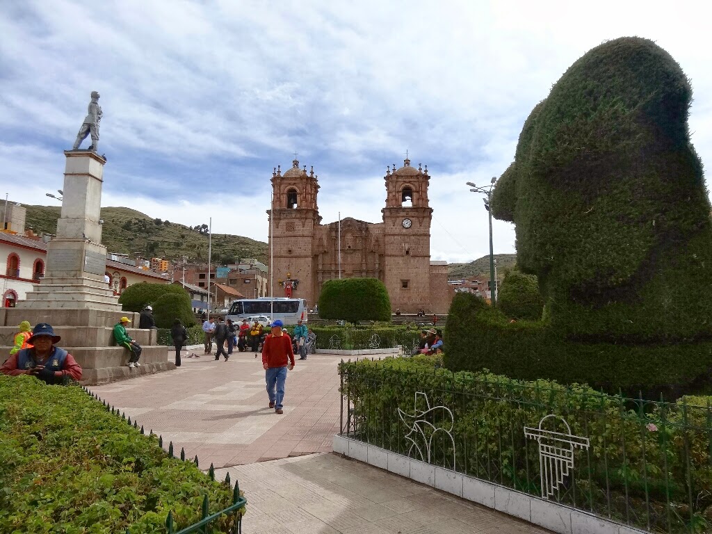 En chemin nous traversons quelques petits villages et des zones cultivées en terrasses ou entourées de petits murs en pierres. A notre arrivée à Puno, un homme monte dans le bus pour proposer des logements. D'habitude on ne prête pas vraiment attention à ces gens mais là ce qu'il propose est plutôt dans nos prix. Il propose aussi des tours pour des îles sur le lac, ce que nous avons prévu de faire. A la gare routière nous le suivons dans son agence. Pour une fois on se laisse porter. Après le déjeuner dans une petite gargote populaire, nous passons un peu de temps en ville. Il y a une ambiance plutôt sympa, les gens sont souriants, mais il n'y a pas grand chose à voir.
