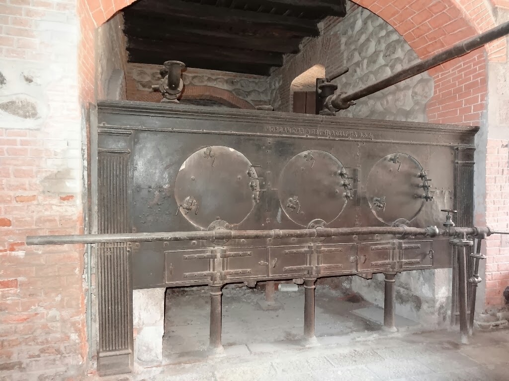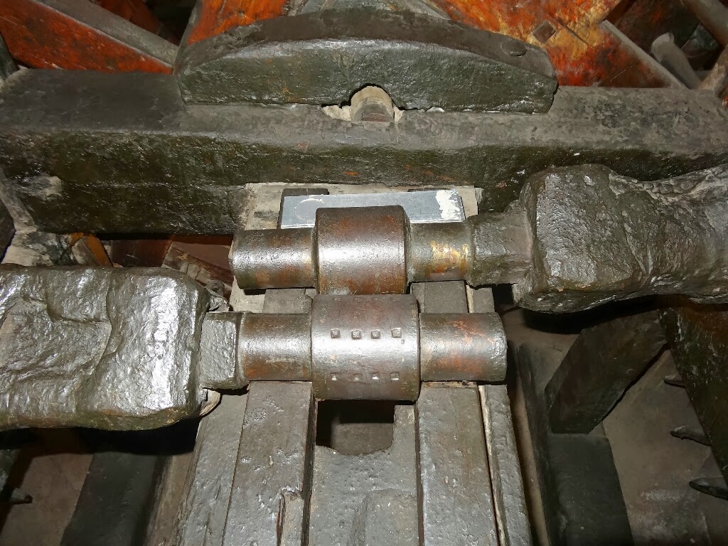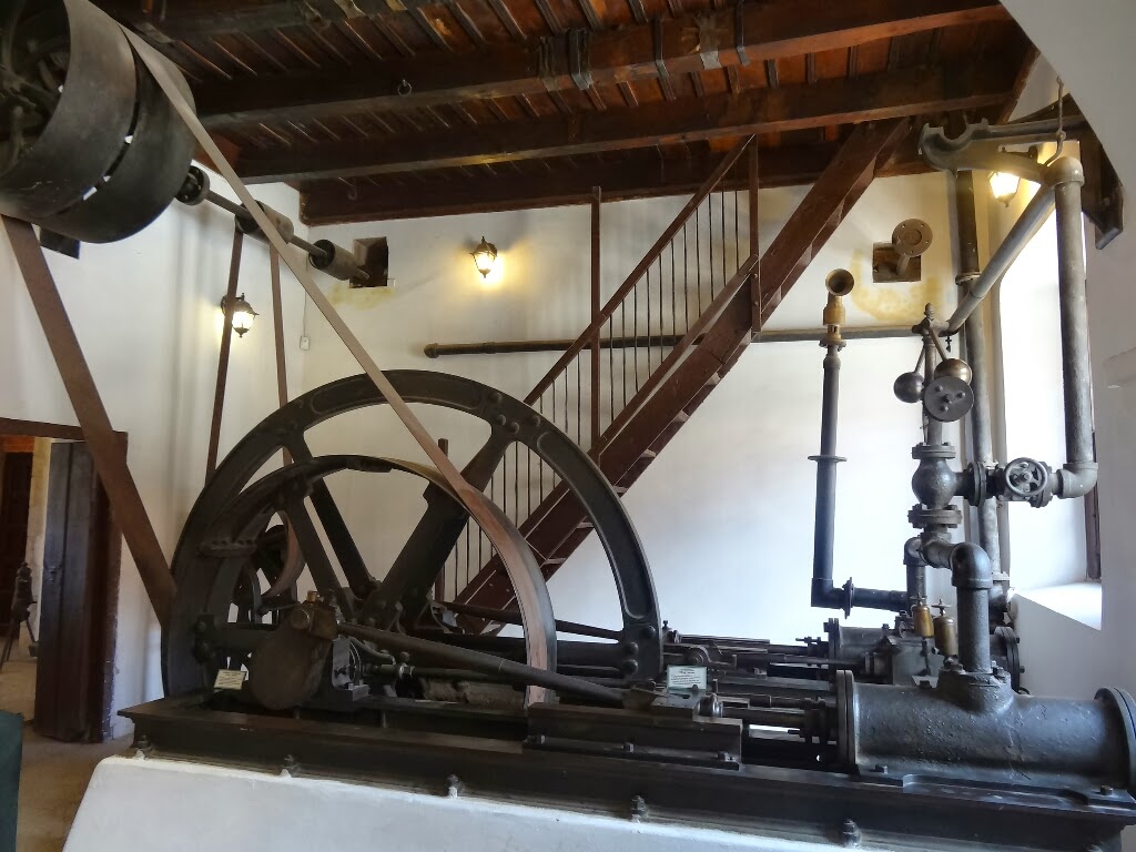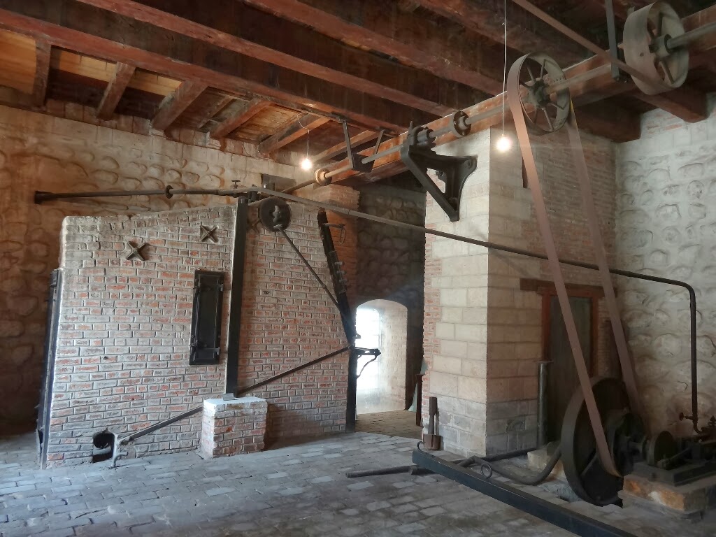Système pour laminer (affiner) les lingots d'argent à l'épaisseur des pièces. L'énergie est fournie par des ânes. A l'étage au-dessus se trouve un système d'engrenages en bois qui permet d'activer deux cylindres en métal dont l'écartement est légèrement plus fin que le lingot. Douze paires de cylindres de plus en plus rapprochés permettent d'obtenir l'épaisseur d'argent voulu.