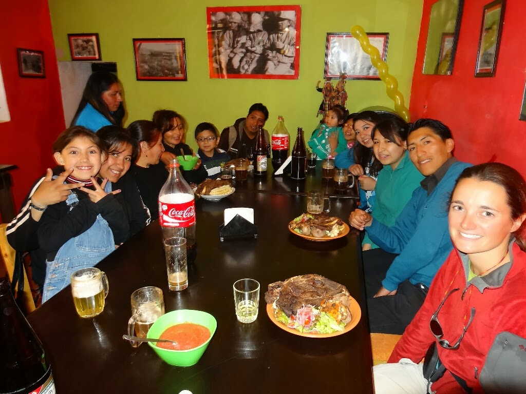 Le lendemain est un jour férié. Nous trouvons une agence tenu par un ancien mineur qui organise la visite des mines actuelles et se bat pour en améliorer les conditions de travail. On réserve cette excursion pour le surlendemain car le lendemain, les mineurs ne travailleront pas, ils décuiteront du jour férié... Le gars de l'agence nous invite à partager le repas du midi traditionnel avec la famille et les amis. On discute et on s'explose la panse de boeuf grillé, patates, salade et bière locale (provenant de la plus haute brasserie du monde bien sûr !). Cerise sur le gâteau, on mange tout ça sans couverts, avec les mains.