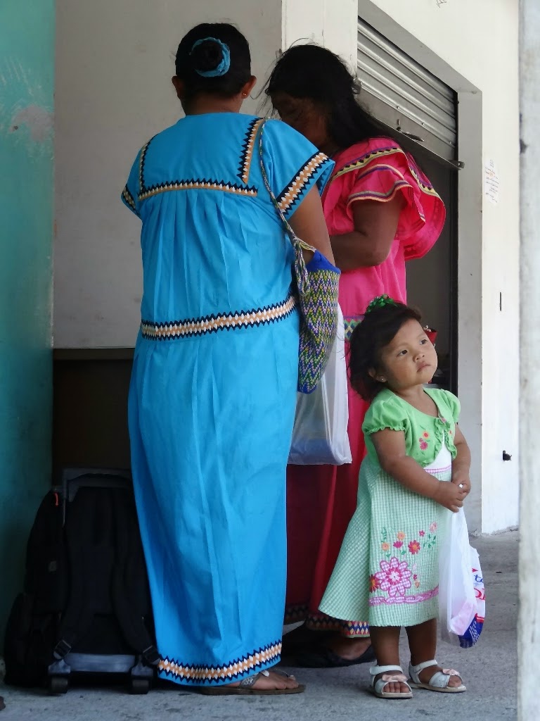 Ici beaucoup de femmes portent une robe en tissu unicolore avec des liserés plus ou moins uniques. Ce qui est drôle, c'est que souvent les petites filles ont une robe assortie à celle de leur maman (pas sur cette photo).