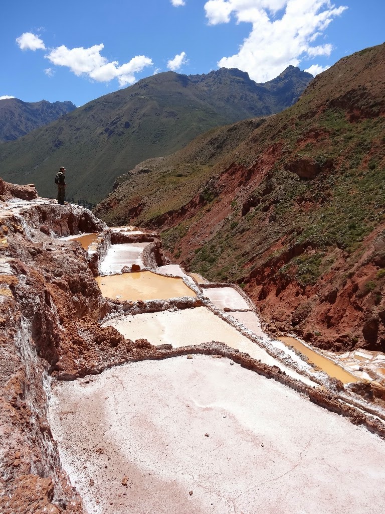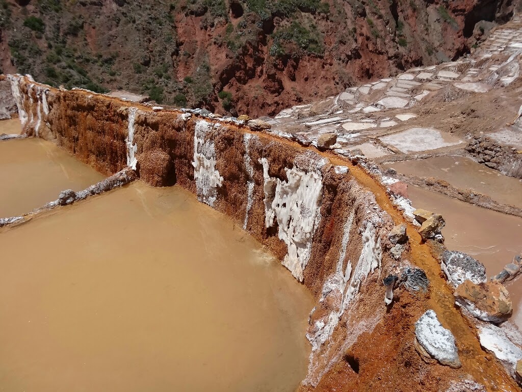 Les salines, comme leur nom l'indique, sont une exploitation de sel, déjà en activité du temps inca. Elles se trouvent dans une petite vallée encaissée d'où jaillit une source salée. Détournée, elle alimente de petits bassins construits sur le flanc de la vallée qui ont pour rôle d'évaporer l'eau et de précipiter le sel. En ce moment, comme c'est la période des pluies, les salines ne sont pas en activité, elles le seront à partir du mois d'avril. Il y a donc peu de travailleurs, les seules personnes que l'on croise entretiennent des terrasses.