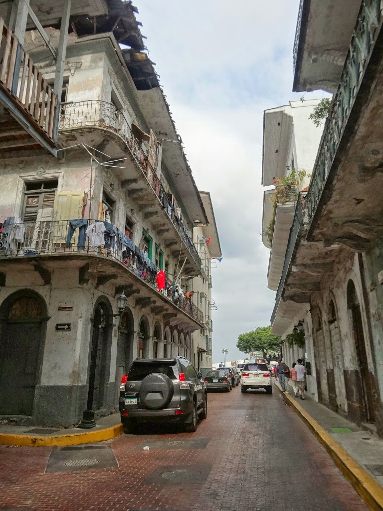 Au bout d'1h30 nous arrivons dans le quartier Casco Viejo (vieux quartier de Panama city), nous posons nos sacs dans un hôtel plutôt attrayant de l'extérieur mais tout pourri à l'intérieur et pourtant c'est pas donné. Nous passons deux nuits ici, on est pas vraiment séduit par l'ambiance du quartier. Ici se côtoient de vieux immeubles rénovés abritant de grands hôtels restaurants et des bâtiments miteux occupés (ou squattés) qui tiennent tout juste debout quand il n'y a pas de structures métalliques pour les soutenir. Les gros 4x4 urbains style Porche Cayenne cohabitent avec les prostituées, les mendiants et les gars défoncés... Il y a des flics partout. Ce quartier est classé à l'Unesco depuis 2003, les travaux de rénovation sont en cours et il y a encore du boulot.